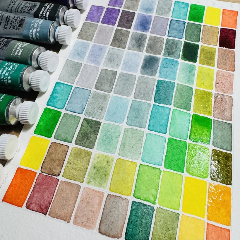J'aime choisir quelques couleurs pour réaliser un nuancier à l'aquarelle, car on en apprends beaucoup sur les couleurs en faisant cet exercice. Par exemple, on n'imagine pas toujours ce qu'on peut obtenir avec telle ou telle couleur.