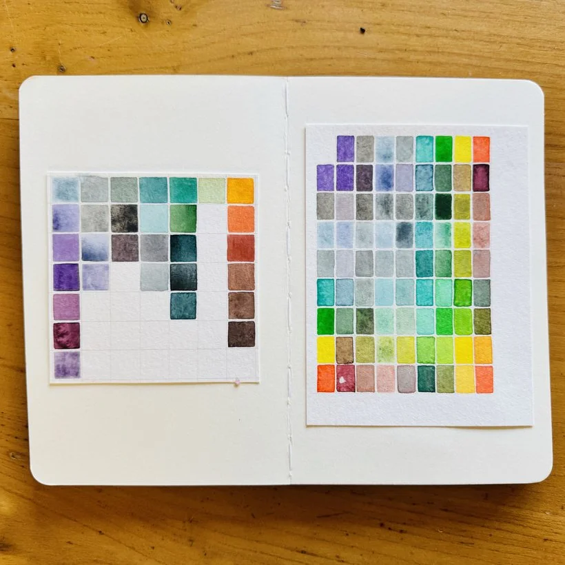 Je prépare un tableau avec les abscisses et les ordonnées (oui comme à l’école) et je peins les mélanges qui correspondent aux croisements des couleurs. Comme les mélanges apparaissent deux fois dans le tableau je fais une case plus diluée que l’autre afin d’avoir plusieurs options pour le même mélange.
